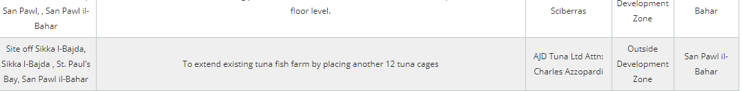 AJD Tuna-a company owned by Azzopardi Fisheries has recently asked for permission to extend the existing tuna penning farm “by placing another 12 tuna cages” off Sikka l-Bajda in St Paul’s Bay.