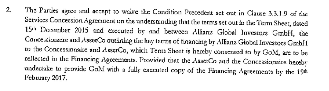 The concession contract required funding agreements to be in place before the concession became effective (clause 3.3.1.9), according to the redacted concession tabled in Parliament. Yet, six months later, Tourism Minister Konrad Mizzi (who negotiated the deal with Vitals) signed a side letter with Vitals waiving that requirement, journalist Daphne Caruana Galizia had revealed. She was assassinated on October 16.