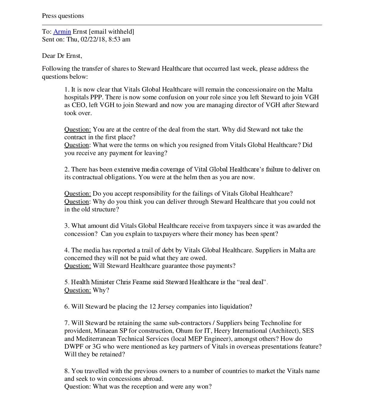 Despite the structural changes within Vitals last week, he retains the role he held before despite the revolving door. Health Minister Chris Fearne has said that it was Ernst who suggested that his ‘new’ employer Steward should purchase the 30-year hospitals concession (which can be extended to 99 years).