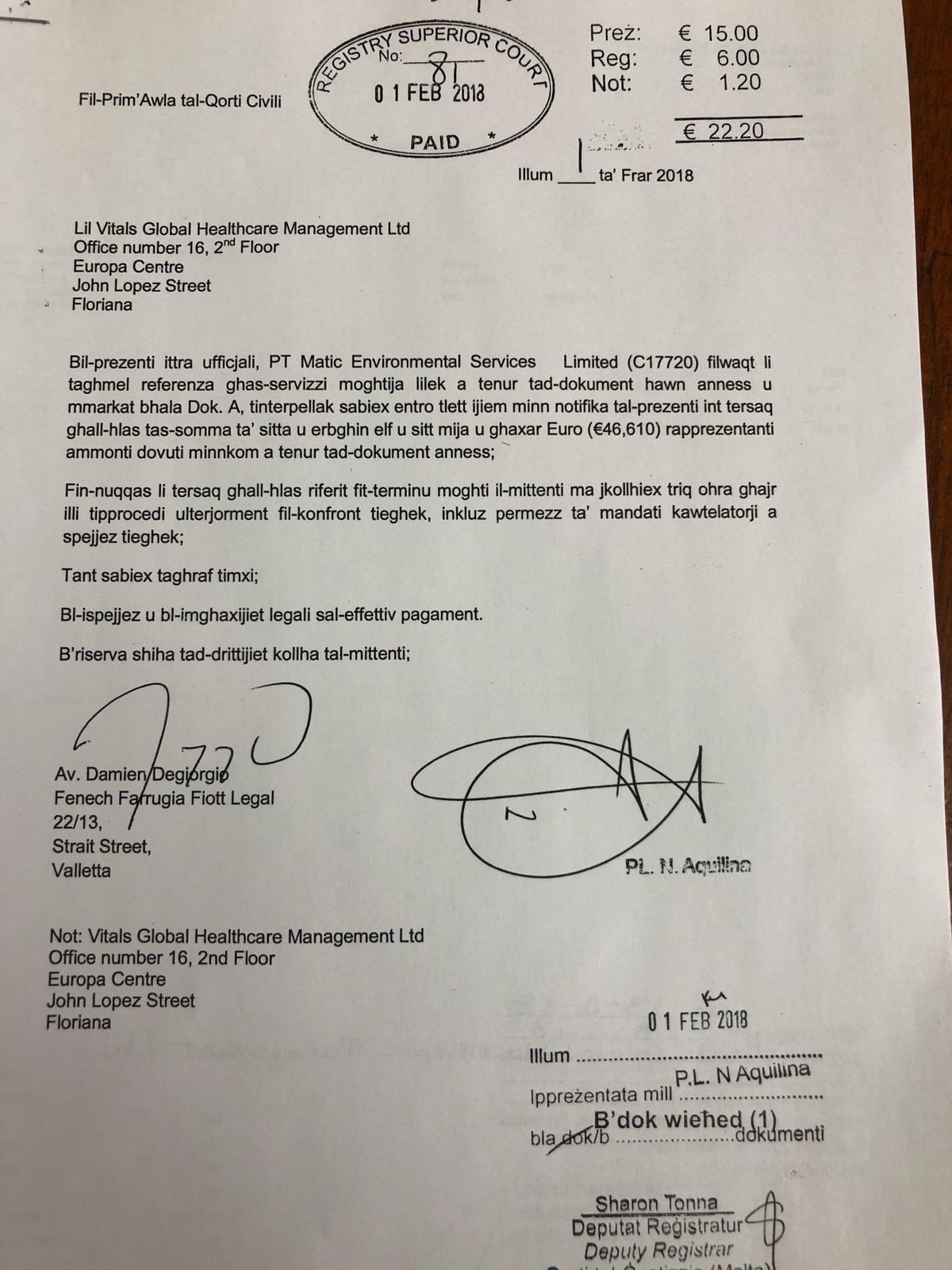 Vitals Global Healthcare, the concessionaires for the operation of the Gozo, St Luke’s and Karin Grech hospitals, were served with garnishee orders for amounts totalling almost €70,000 in the last month.