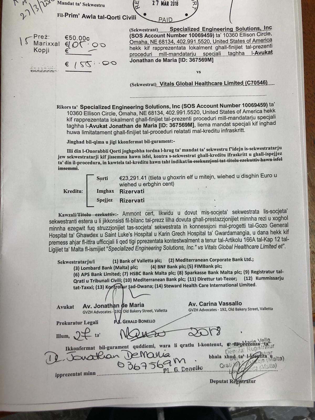 Two garnishee orders were filed in court: one by PT Matic Environmental Services (PTM) for a debt totalling almost €47,000 filed on 1 Feb, and another by an American company Specialized Engineering Solutions (SES) for over €23,000 filed on 27 March.