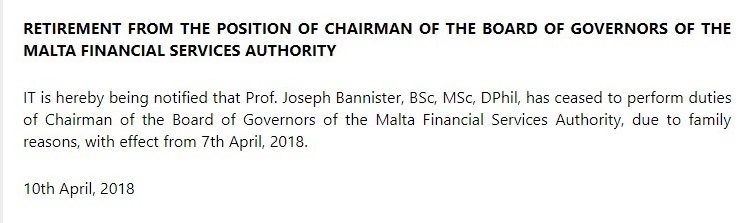 The chairman of the Malta Financial Services Authority (MFSA) Joe Bannister, who has presided over several unresolved controversies during his tenure, quietly left his post “for family reasons” while the former head of the Malta Gaming Authority Joseph Cuschieri will become the new CEO, according to announcements in the government gazette.