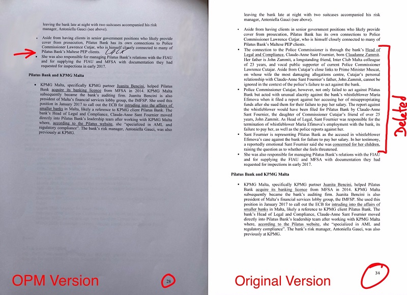 The Office of the Prime Minister gave foreign journalists a doctored report in which “someone went through the trouble of removing paragraphs on Pilatus Bank”, according to revelations in a series of international investigations on the assassination of Daphne Caruana Galizia.