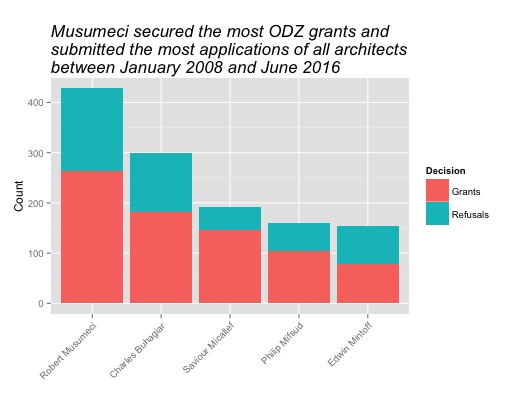Between January 2008 and March 2013, 54% of ODZ applications submitted by the average architect, excluding Musumeci, was granted permission. From May 2013 to June 2016, the figure rose to 65%, which is 22% lower than Musumeci’s corresponding figure.