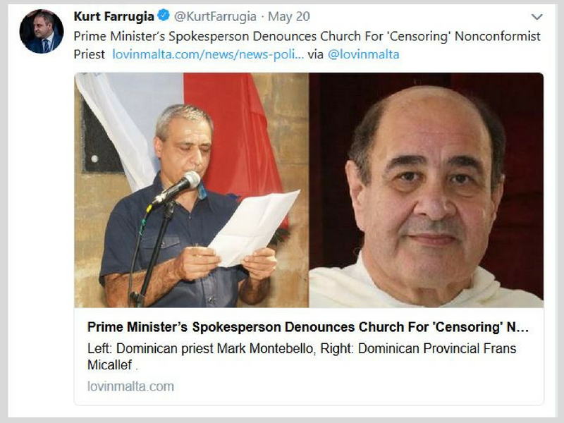 Despite the unverified It-Torċa editorial, government head of communications Kurt Farrugia tweeted early on Sunday morning that “[t]he Church censors one of its most progressive thinkers”, adding ‘Freedom of speech in #Malta seems a privilege only afforded to conservatives. Outrageous”.