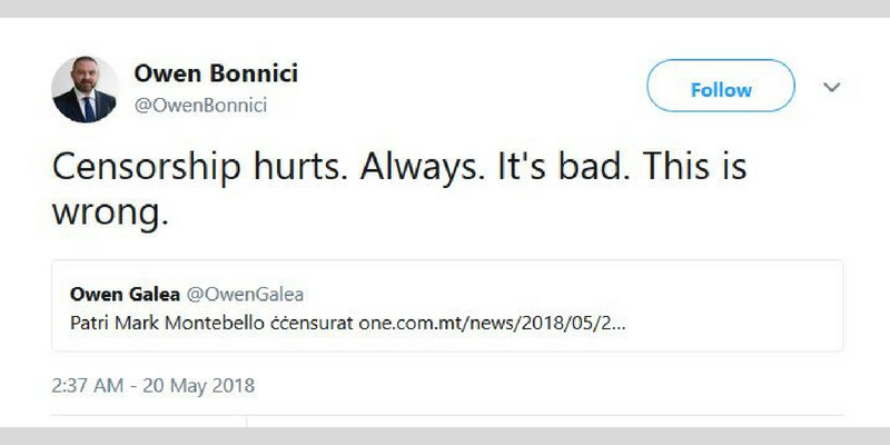 Justice Minister Owen Bonnici tweeted a link to the same One News coverage, saying “[c]ensorship hurts. Always. It’s bad. This is wrong”.
