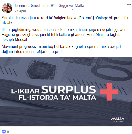 Dominic Grech, Chair of Labour think-tank Fondazzjoni IDEAT and Labour Party Administrative Board Member, attributed the surplus to Muscat personally, describing it as evidence of Labour being “the best of the best”.