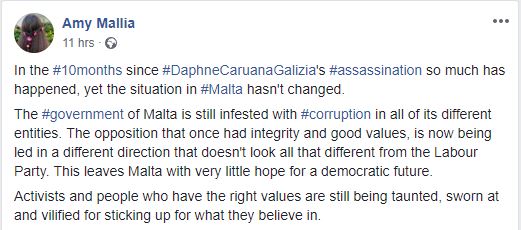 Caruana Galizia’s niece, Amy Mallia, wrote in a Facebook post that “in a normal country… we would be able to grieve our loss without persecution or being told by Michelle Muscat that she feels more sad about Daphne’s murder than we do”.