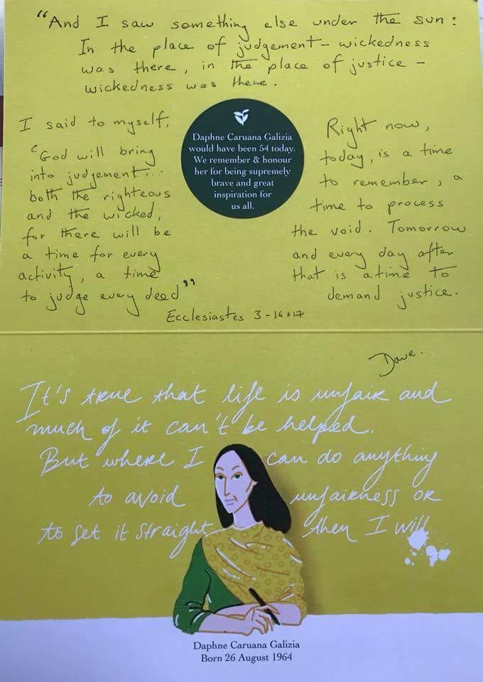 Messages of love, support and sadness at the killing of journalist Daphne Caruana Galizia were handwritten and sent from different countries around the world in bespoke birthday cards organised by activist group Il-Kenniesa and uploaded on social media.The cards will also be placed at her memorial in Valletta during an event at 8pm on Sunday to mark her birthday.