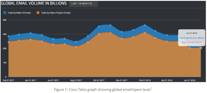 According to Cisco’s report, on 1 May 2018, the total volume of email was 433.9 billion messages – of this, spam accounted for 370.04 billion messages, or 85.28 % of all email. On 1 August 2018, the total volume of messages was 361.83 billion, 85.14 %, or 308.05 billion messages, identified as spam.