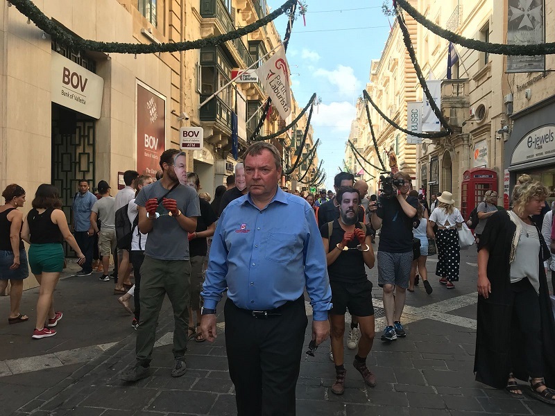 Crew members walked down Republic Street wearing handcuffs and their hands stained with red paint while wearing masks of Prime Minister Joseph Muscat, German Chancellor Angela Merkel, German Interior Minister Horst Seehofer and Italian Interior Minister Matteo Salvini.