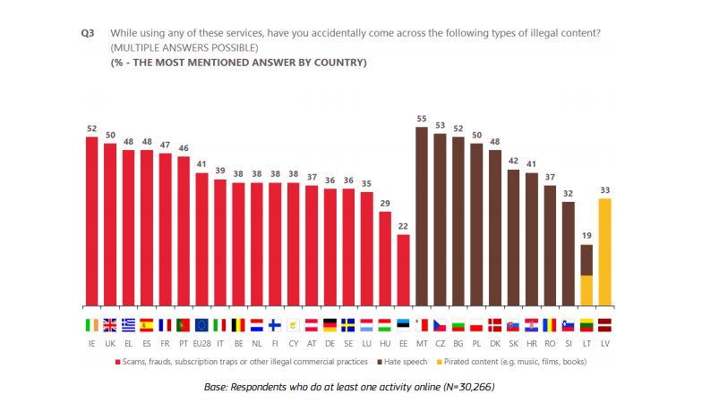 Estonia (15%), Italy (17%) and Lithuania (19%) are the only countries where fewer than one in five say they have come across hate speech.