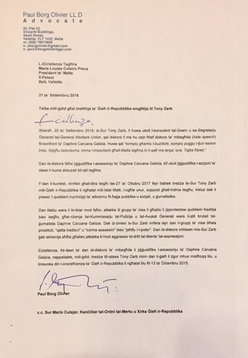 Soon after the video emerged, former PN general secretary Paul Borg Olivier formally requested President Marie Louise Coleiro to strip Zarb of his Gieh ir-Repubblika honour, which he did not deserve because of his hate speech.