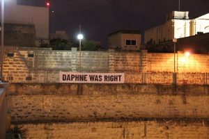 ‘Daphne was right’ appeared on banners and graffiti overnight in different localities in Malta marking 13 months since Maltese journalist Daphne Caruana Galizia was assassinated.