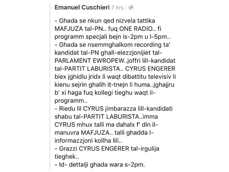 This was made public on the Labour Party’s radio station because Engerer leaked the recording. The leak was promoted by Labour Party radio host Emanuel Cuschieri on social media.