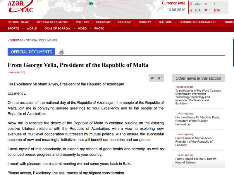 Alas, no, that was just a collection of carbon copied greetings from Aliyev to those monarchs on their national day. I’m pretty sure that, unlike Joseph Muscat, they didn’t return his calls.