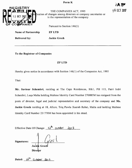 ZF Limited was registered in April 2017 (C 80459) with Schembri as the sole shareholder and director. In October 2017, three months after being appointed parliamentary secretary, Schembri stepped down as director but retained full ownership. Jackie Grech, a partner in Charles Scerri & Associates, was appointed as sole director in his place. Schembri then appointed her to the Board of Governors of the Malta Gaming Authority.