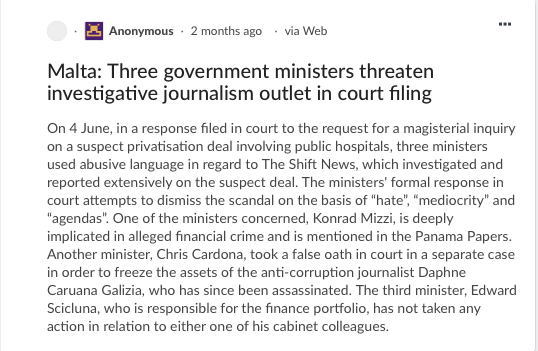 The database lists four threats against The Shift News in only one year: on cyberattacks, threats of SLAPP lawsuits, and even an attempt by the Speaker of the House Anglu Farrugia to get the news portal to alter the content of reports.