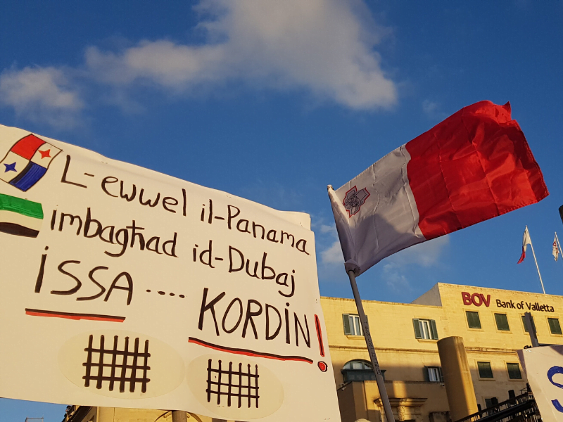 Protestors held up signs saying “you betrayed your own people”, “mafia”, and “you killed a journalist to stay out of jail”.