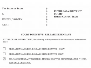 Two days after his arrest, Fenech was released under court order and taken to Sierra Tuscon Hospital, a treatment centre for drug and alcohol addiction, where he was admitted on 17 July. The court sentence refers to Texas Penal Code § 12.44(a), where there is a reduction of State jail felony punishment to misdemeanor punishment seeing to the rehabilitative needs of the defendant.