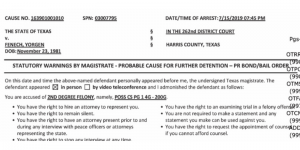 According to court documents dated July 16, the court “orders the defendant committed to the custody of the Sheriff of Harris County, Houston, until he posts the required bond or until further order of the Court”.