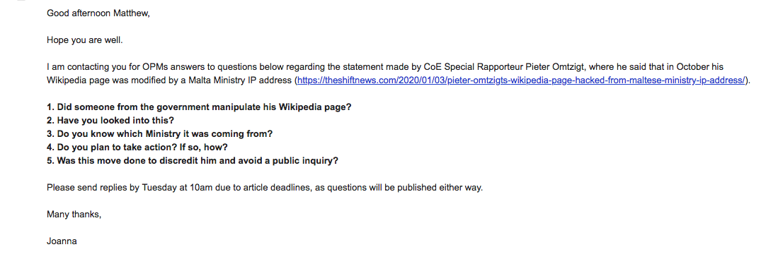 The Office of the Prime Minister has not replied to questions sent on the statement made by Pieter Omtzigt, Special Rapporteur of the Parliamentary Assembly of the Council of Europe (PACE), regarding the manipulation of his Wikipedia page last October from an IP address of a Maltese ministry.
