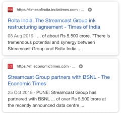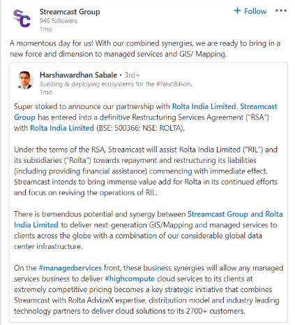 Public announcements by Rolta India, a company which appears to be struggling financially, were to the effect that Streamcast Group entered into a definitive restructuring services agreement with Rolta India under which, in exchange for Rolta India transferring certain parts of its business to a Rolta subsidiary (the “slump sale”), Streamcast would “invest” the equivalent of €698 million, co-incidentally the headline amount of its over-hyped investment in a data centre in India.