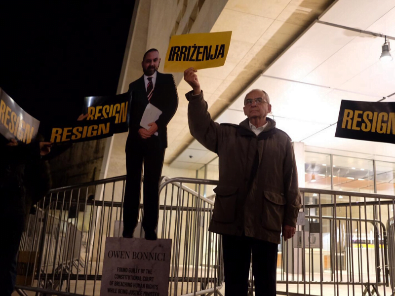 Activists then proceeded to Parliament Square where they placed a cardboard statue of Bonnici and held up signs with the word, ‘resign’.