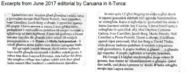 During his testimony, Caruana was questioned about an editorial that he wrote in June 2017 while editor of Labour-leaning newspaper L-Orizzont, which is owned by the General Workers Union, where he named and called out journalists reporting on government corruption to be expelled from the country. “From my perspective, those journalists used to cause harm,” he said.