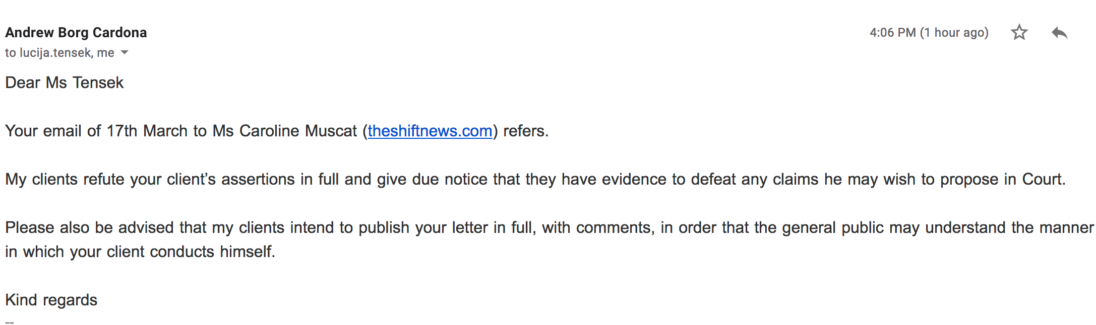 The Shift replied saying documentary evidence was available to support reports and refuted all claims made in the letter. The Shift also made it clear that it would publish the correspondence received because it was in the public interest to know how Curavić was behaving after his adventure in Malta.