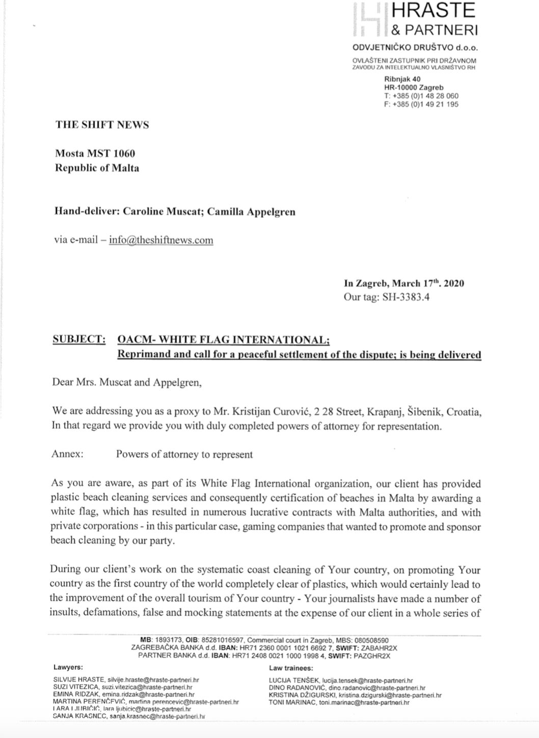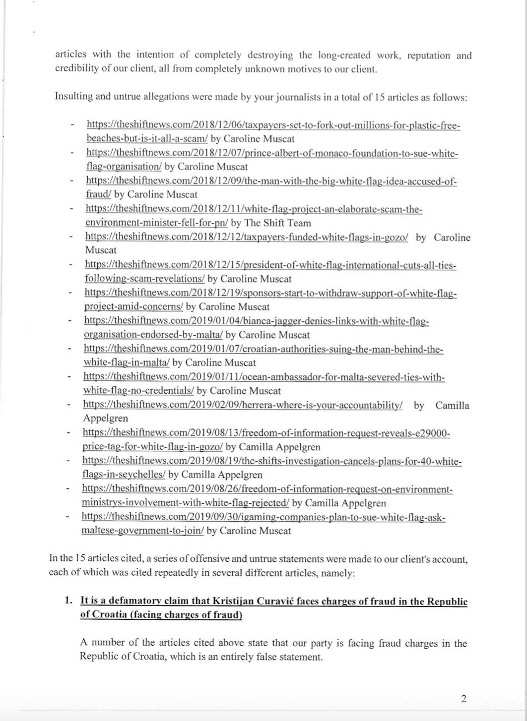 Croatian Kristijan Curavić, the man behind the idea of the White Flag scheme, has demanded that The Shift deposit €300,000 into a bank account within 15 days for damages he claims to have suffered as a result of articles exposing the scam.