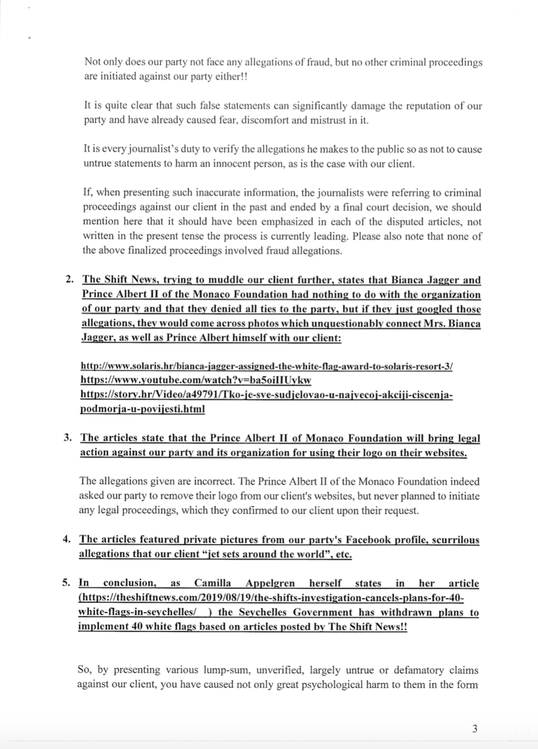 Curavić also wants a public apology in the form of an article on The Shift as well as the correction of “all false allegations”.