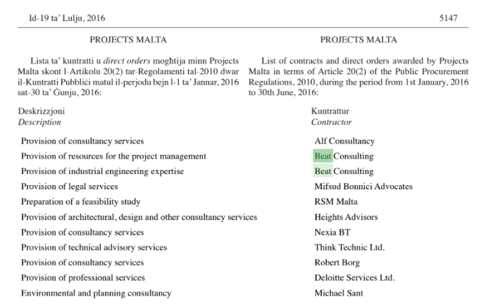Projects Malta – a government entity formed by Labour to coordinate Private Public Partnerships on behalf of the government and controlled by Mizzi – become one of BEAT’s major clients with direct orders awarded every few weeks, mostly for unspecified projects.