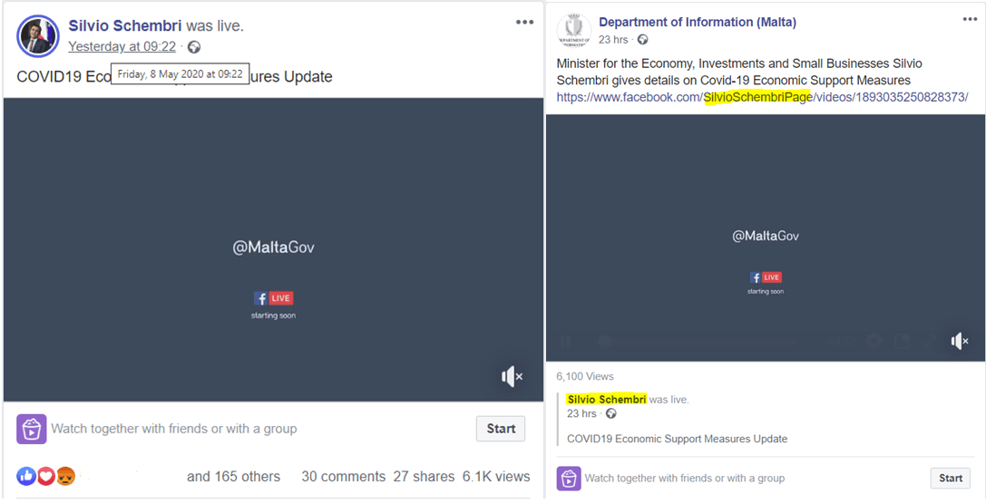 On 8 May, barely a day after the Commissioner’s findings, Schembri published a live feed from his personal Facebook page of a press conference on COVID-19 Economic Support Measures together with Kurt Farrugia. The official Department of Information Facebook page then duly shared the post.