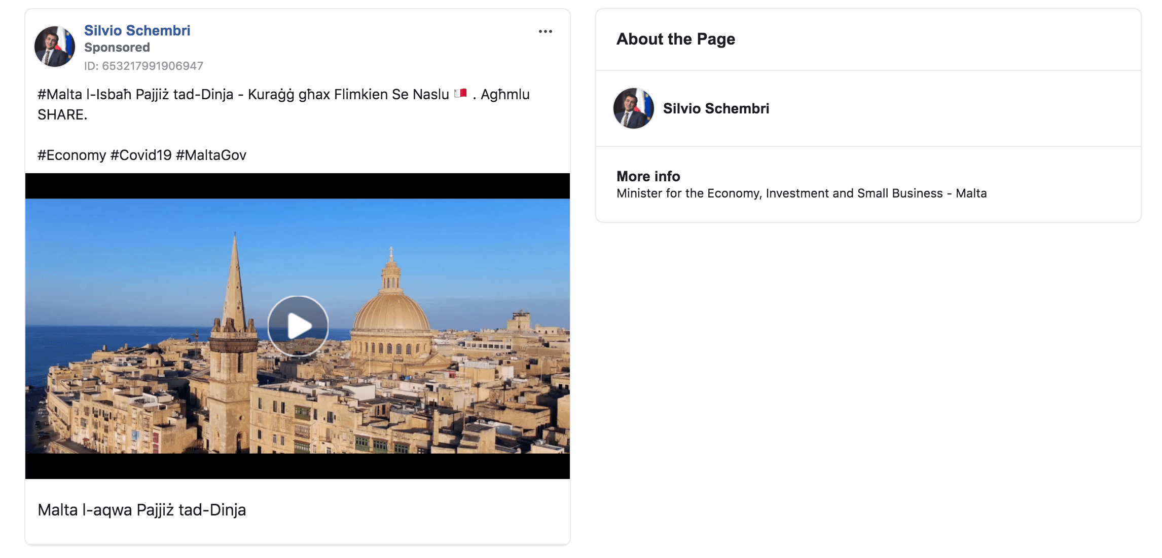 On the day the report was published, Schembri also launched a Facebook advert (below) with the words “Malta is the best country in the world”, promoting his portfolio amid efforts to fight COVID-19. The video appears to have been first published on the Malta Enterprise Facebook page, a page with a fraction of Schembri’s heavily promoted page’s “followers”.