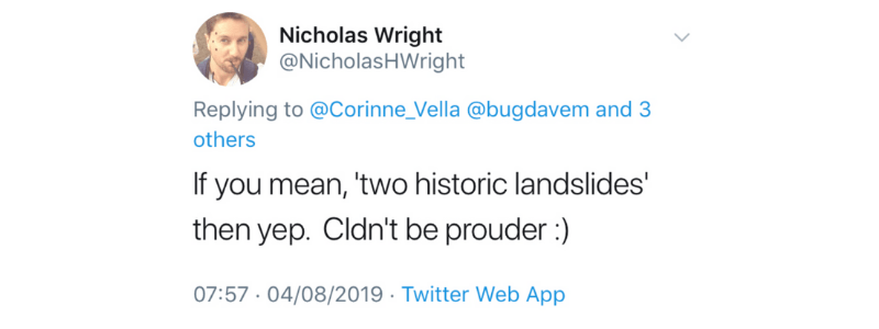 In 2017, he “did not have a dog in this fight” he said on social media referring to the general election, only to later say he did when replying to another tweet the following year: “If you mean two historic landslides, then yep. Couldn’t be prouder.”