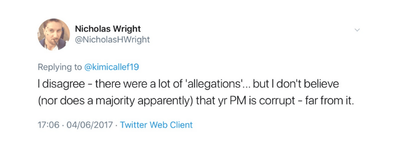 “There were a lot of ‘allegations’…but I don’t believe (nor does the majority apparently) that your prime minister is corrupt – far from it.”