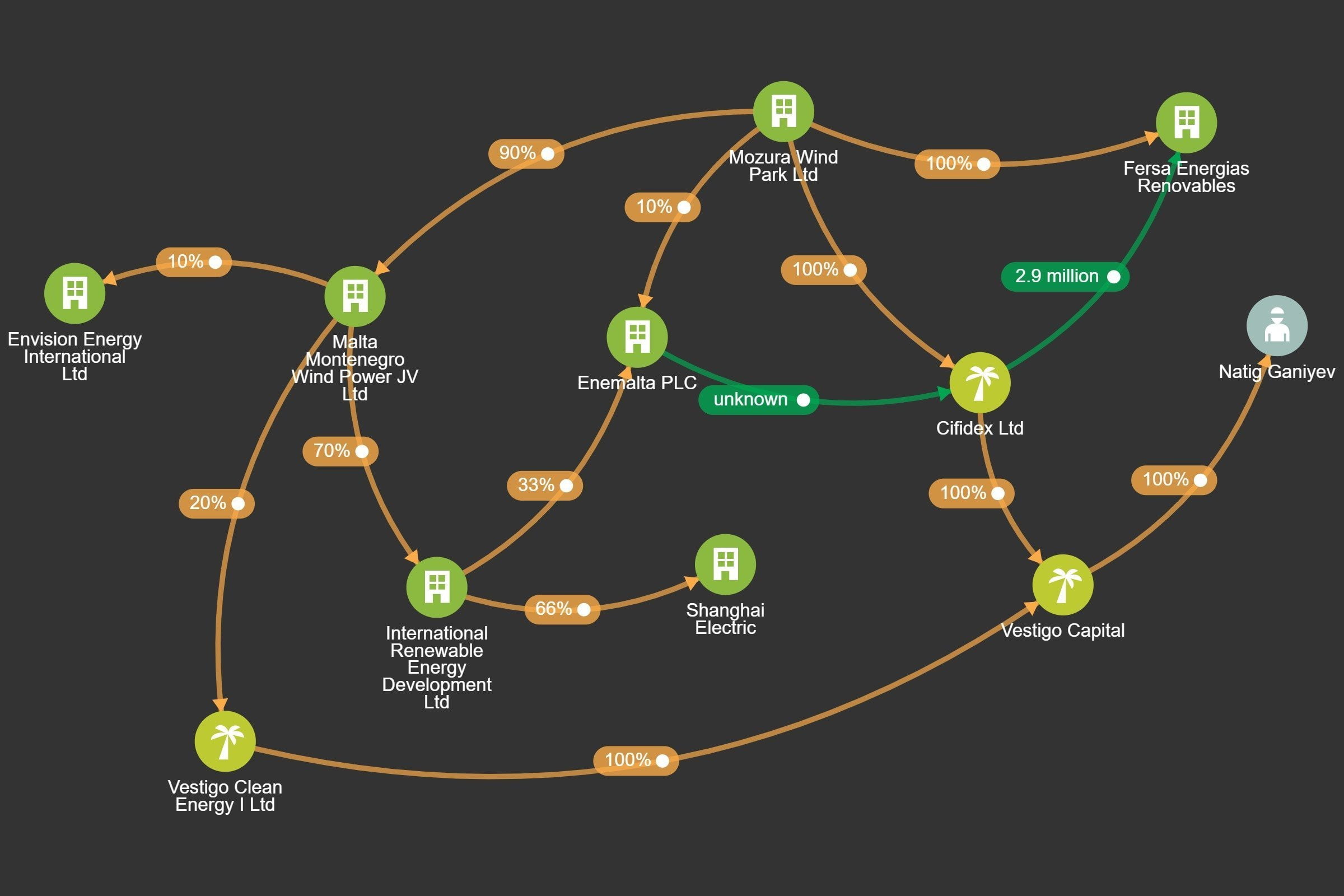 The wind farm project in Mozura involves Montenegro’s government, Malta’s State-owned electricity company Enemalta, China’s Shanghai Electric, and several offshore companies including one owned by Azerbaijani-British national Turab Musayev, who was SOCAR Trading’s representative on the Board of Electrogas.