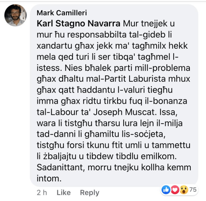 In a recent exchange on Facebook, he was taken to task by Mark Camilleri, a Labour militant and chairperson of the National Book Council who stepped out of the political game after Chris Fearne’s defeat in January that placed Robert Abela at the helm.