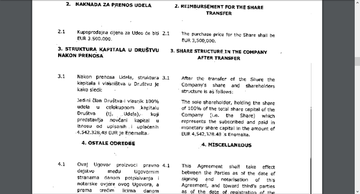 Yet, this was not the purchase price declared to Montenegrin authorities. In the Share Sale Agreement (SSA) dated 28 December 2015, the final sale price declared was €3.5 million. This was not indicated as a down payment or deposit, but the agreed full price on the deal.