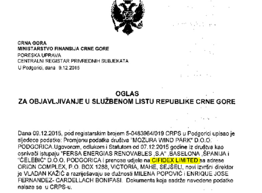 The presence of Cifidex in Finance Ministry documents is further supported by information published in the Official Gazette of Montenegro where Cifidex was briefly registered as the holder of the Mozura concession.