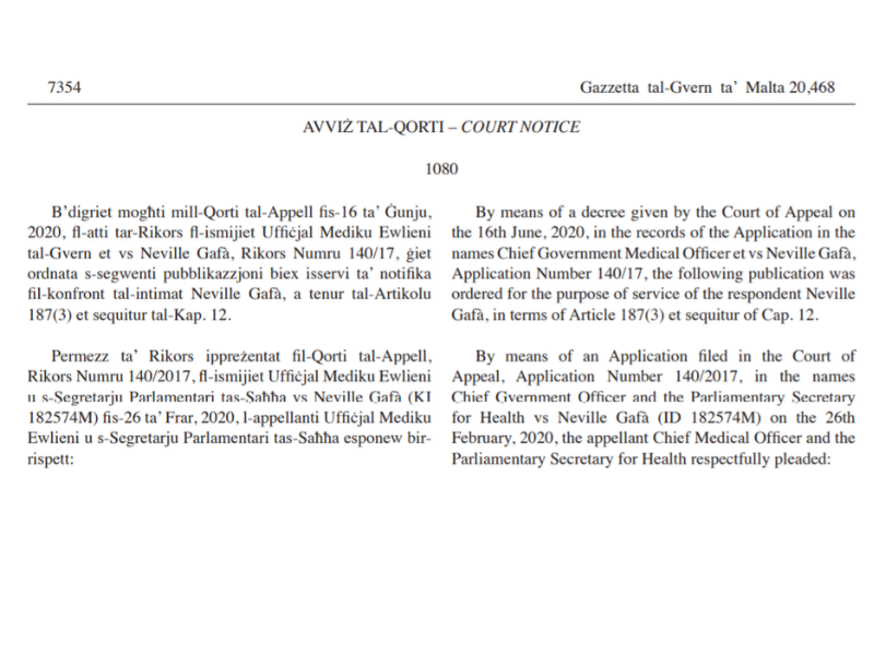 Deputy Prime Minister Chris Fearne and the Chief Medical Officer were forced to publish a notification in the Government Gazette to inform Labour crony Neville Gafa’ of a pending court case, as the former OPM operative has somehow ‘disappeared’.