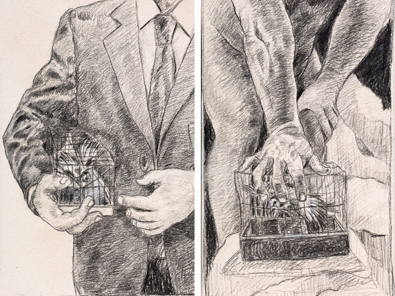 Throughout the 30 pieces, you see excessive pressure being applied to the cage as the goldfinch struggles inside.