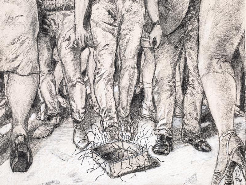 It was at about that time that Farrugia began to notice the pressure that press freedom was under, and he “felt [he] had to express [himself]”, and began painting in the colours he was accustomed to. A few months later, the journalist’s assassination sent ripples throughout the island and the world, and eliminated any remnant of colour from the artist’s palette, in a natural transition to dark charcoal.