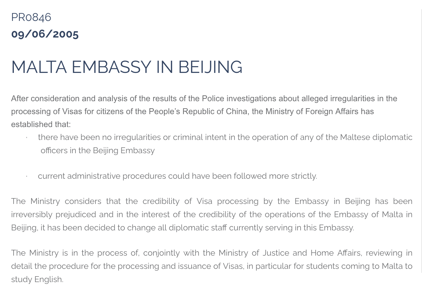 The Ministry had declared that it considered the credibility of visa processing procedures by the embassy in Beijing to have been “irreversibly prejudiced”, and that in the interest of that overseas mission “it has been decided to change all diplomatic staff currently serving in the embassy.”
