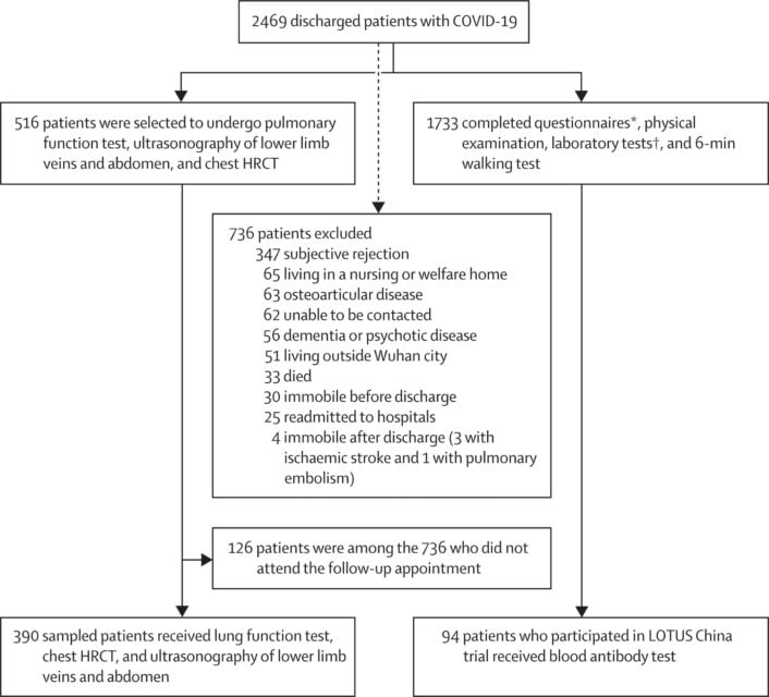 They also underwent physical examinations, a six-minute walking test and a blood test. About 350 patients were tested for lung function and had chest CT scans and ultrasounds. The median age of the eligible patients was 57.