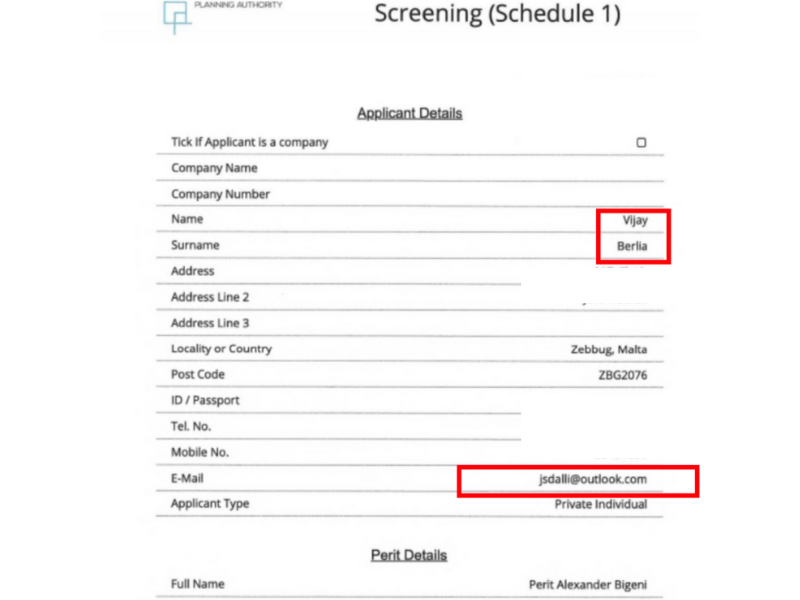 Further research carried out by The Shift shows that Berlia, whose family has bought Maltese passports, listed Dalli’s email address in the application in case the Planning Authority wanted any clarifications on his application or to contact him.
