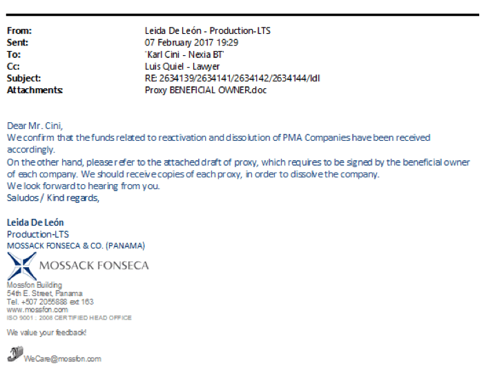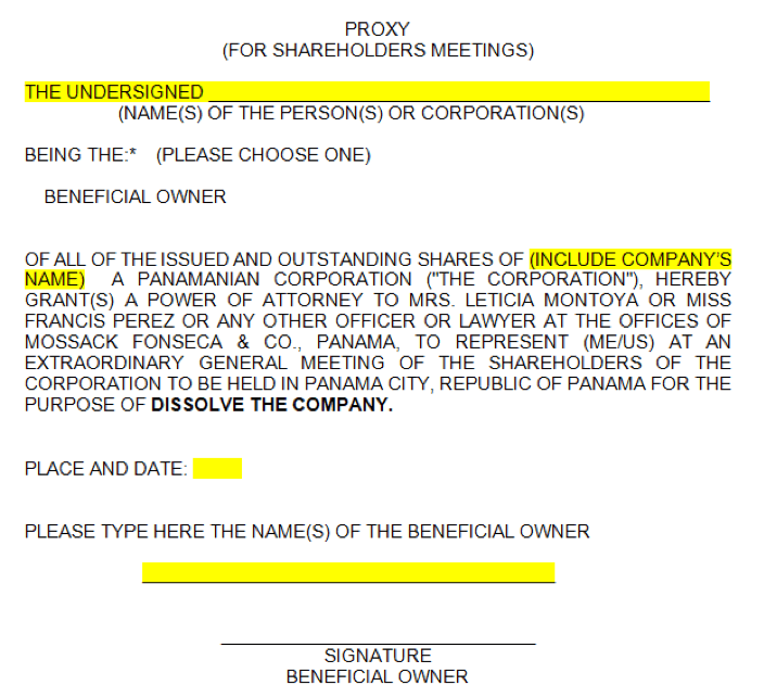 Billing was not the only thing on beleaguered MossFon’s mind. The company also took the opportunity of a client wishing to liquidate companies to collect some further details on UBOs. De León sent Cini a blank template proxy form telling him that this form needed to be filled in and signed by the beneficial owner of each company in order to dissolve the company.