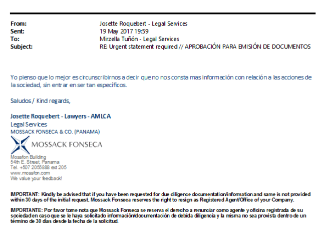 Mirzella Tuñón from MossFon’s legal team finally replied. “Dear Mr Cini, I am currently awaiting the approval from the lawyer to the draft prepared…. However, we are pleased to confirm how the [bearer shares] work in a [Panama] company… in the practice, the subscribers do not become shareholders because through the written document, the subscribers waive any rights they may have to the shares and assign them to the client”.