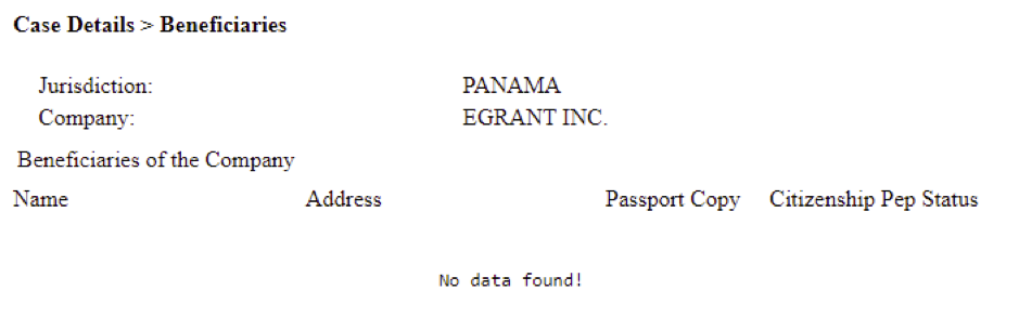 Mossack Fonseca’s system had no record of Egrant’s Ultimate Beneficial Owner and its billing system had no record of interactions on Egrant between August 2013 until October 2016.